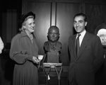Robert Ricci, head of a Paris dress and perfume house, learns about Texas from Jacqueline Cochram, noted woman flier who had her own cosmetics business, as they chat before a bust of John Nance Garner in the office of Amon carter. Published in the Fort Worth Star - Telegram morning edition, September 27, 1950.