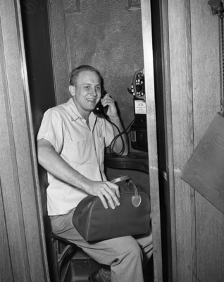 Rudolph Koci Jr., son of Mr. and Mrs. Rudolph Koci of 2115 Ross, wasn't a bit downhearted when he arrived at the T&P Passenger Station to board a bus for induction into the Army at Love Field. The 1947 North Side High School graduate is phoning a "girlfriend." Published in the Fort Worth Star - Telegram evening edition, September 26, 1950.