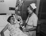 Mrs. Lillie Belle Grimland, one of the first graduates of the Practical Nursing Program of the Fort Worth Public Schools, is skilled in bedside technique. She is shown taking the blood pressure of Mrs. E. E. Bell, 1417 Richmond, a patient at Harris Hospital. Published in the Fort Worth Star - Telegram evening edition, September 29, 1950.