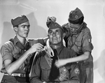 John Santerre of Route 2, Grand Prairie, is shown getting those last-minute touches to a good Scout uniform just before getting his Life award in the Boy Scouts along with his sons, Roy, left. Marcel, right, Roy's brother, received his first-class rank at the same court of honor of the Arrowhead district. Published in the Fort Worth Star - Telegram evening edition, October 3, 1950.
