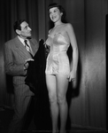 Jimmie Williams, who received the most votes in a TWC contest to determine its best dressed students, became an unofficial model for vaudeville headliner Alphonse Berge. He recreated on Jimmie the gown of uncut material he styled for a forthcoming Hollywood film. Published in the Fort Worth Star-Telegram evening edition, January 20, 1950.