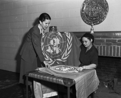 County Home Demonstration Agent Gayle Roberts holds a United Nations flag ordered from a commercial firm as Mrs. Glen Grant works on a flag being made by the Avondale Home Demonstration Club to fly over the community center on U. N. Day. Published in the Fort Worth Star - Telegram morning edition, September 28, 1950.