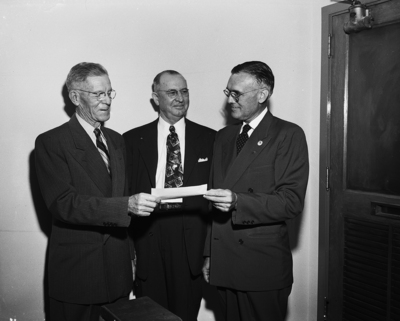 A check for $142,578.21 was brought to Fort Worth's city tax office by R. H. Waterman, right, tax commissioner for the Texas and Pacific Railway, in payment of the railroad's 1950 city and school district ad valorem taxes-four months ahead of the January 31, 1951, deadline. Accepting the check are W. C. Curlee, center, city tax assessor collector, and Priest Lipscomb, chief clerk. Published in the Fort Worth Star - Telegram evening edition, September 27, 1950.