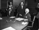 T. M. Gooch Jr., left, chairman of the Chamber of Commerce fire prevention committee, thanks Mayor Deen at City Hall for declaring the week of October 8 as Fire Prevention Week. The proclamation was brought to city hall by five firemen on a fire truck with sirens screaming. Published in the Fort Worth Star - Telegram evening edition, September 27, 1950.