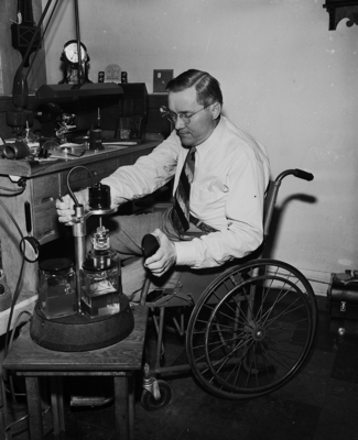 Marvin Wells, damaged from the hips down by arthritis, dips a watch in a cleaning apparatus at a repair shop at Fort Worth as he went about the business of learning a trade that a physically challenged man can do. Published in the Fort Worth Star - Telegram morning edition, September 29, 1950.