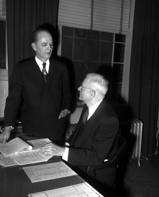 B. B. Cobb, seated, outgoing executive secretary of the Texas State Teachers Association, prepares to turn his duties over to Charles Tennyson, standing, association public relations director.