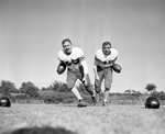 Posed action image of Warren Neal, left, and Dick Bourland of Arlington Heights are seldom given ball-carrying assignments as they are blocking backs. Both will see action against Polytechnic High. Published in Fort Worth Star-Telegram morning edition October 18, 1950.