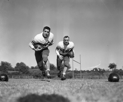 Van Williams, left, and Charles (Chuck) Spencer are expected to be two of Arlington Height's big guns against Stephenville at Farrington Fields. Williams plays halfback. Co-Captain Spencer is the quarterback. Published in Fort Worth Star-Telegram morning edition September 28, 1950.