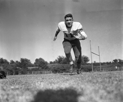 Posed action shot of Don Ellis, 201-pound Arlington Heights center, is being boomed for an all-state berth. He's co-captain of the Jackets. Published in Fort Worth Star-Telegram morning edition October 1, 1950.