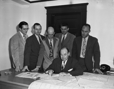 Members of the Texas -Louisiana ad valorem tax unit of the Continental Oil Company's tax division, moved to Fort Worth from Ponca City, Oklahoma. Explaining a tax problem is Charles R. Bell Ponca City, assistant director of the tax division. Moved to Fort Worth, left to right, are: F. J. Milan, clerk; Carroll M. Heltzel, Charles Keisery, Ed J. Clark and Tom G. Matlock, tax agents. Published in the Fort Worth Star - Telegram evening edition, September 29, 1950.