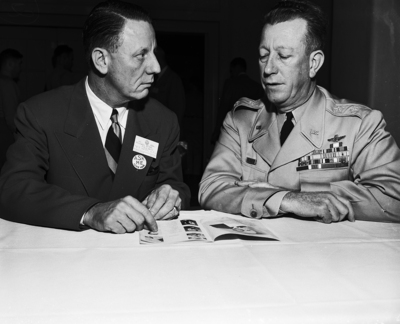 Lieutenant Colonel Brandon Stone, left, president of the Fort Worth chapter of the Air Reserve Association, looks over the day's program for the ARA convention at Hotel Texas with Major General Earl S. Hoag of Washington, special assistant to the air chief of staff for reserve components. Published in the Fort Worth Star - Telegram evening edition, September 28, 1950.