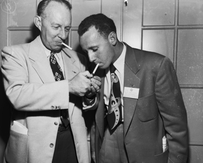 Captain Frederick P. Hill, Bangor, Maine, lights a cigarette for Technical Sergeant Ralph Daughterty of Collingwood, N. J. Published in the Fort Worth Star - Telegram morning edition, September 29, 1950.