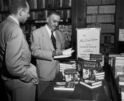 Author Claud Garner, right, autographed copies of his second novel while discussing a tour of other Southwest cities with Robert Rainer, representing his publisher, Creative Age Press. Published in the Fort Worth Star - Telegram morning edition, September 29, 1950.
