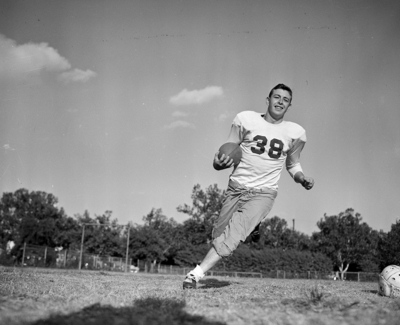 Posed action image of Johnny Cozart, Paschal fullback, is one of the top runners in Fort Worth high school football. He's a junior, weighing 150 pounds. Published in Fort Worth Star-Telegram morning edition October 3, 1950.