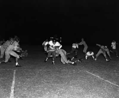 Action shot of Ronald Clinkscale (44) scores Arlington Heights second touchdown on five-yard run against Stephenville in the first quarter. Published in Fort Worth Star-Telegram evening edition September 29, 1950.