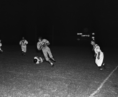 Action shot of Quarterback Harry Brauer, Stephenville's leading runner with 100 yards net in 23 carries, goes 17 yards in second quarter of the game against Arlington Heights. Published in Fort Worth Star-Telegram evening edition September 29, 1950.