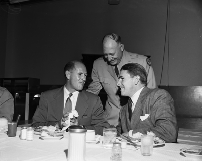 Ray O. Ryan, left, Convair vice president and division manager, was host to delegates to the Air Reserve Association convention at a luncheon at the plant cafeteria. He is shown talking with Brigade Gen.eral C. S. Irvine, Carswell Air Force Base commander, and Assistant Air Force Secretary Harold C. Stuart at the head table. Published in the Fort Worth Star - Telegram morning edition, September 30, 1950.