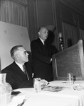 Thomas K. Finletter, right, secretary for air, told delegates at the Air Reserve Association convention at Hotel Texas that the Air Force plans to continue to activate the reserve and the Air National Guard. At left is Air Force Undersecretary John A. McCone. The delegates gave Finletter a standing ovation. Published in the Fort Worth Star - Telegram evening edition, September 29, 1950.