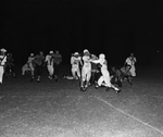 Paschal's Gaines Godfrey (son of Mr. and Mrs. Berl and Cleva Godfrey), left, and Robert Towery, right, strain to keep Amarillo's Ray Gingham from crossing the goal line in the second quarter. They halted him on the two. However, the Sandies scored on the next play.