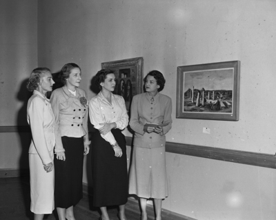 Pictured in the art gallery of the Fort Worth Art Association are heads of service and cooperative committees, left to right, Mmes. Jack Gaither, school relations; David Hawes, placement; Olcutt Phillips, radio, and Vaughn Wilson, education. Published in the Fort Worth Star - Telegram morning edition, October 8, 1950.