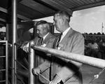 Ray Willoughby of San Angelo, left, president of the Texas and Southwestern Cattle Raisers Association, and D. W. Williams, right, vice chancellor for agriculture of Texas A&M College, are shown at the dedication of the college's beef cattle center. Both took part in the ceremonies. Published in the Fort Worth Star - Telegram morning edition, October 1, 1950.