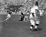 Baylor Halfback Don Carpenter (27) takes off with Larry Isbell's pass for 27-yard gain to University of Houston 31-yard line on fifth play of the game as teammate blocks Cougars' David Gregg (87). Pay was part of a 76-yard touchdown drive as Bears won stadium dedication tilt, 34-27. Published in Fort Worth Star-Telegram October 2, 1950.