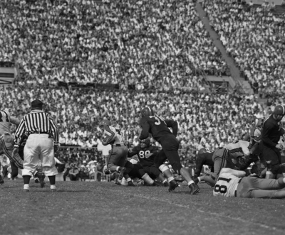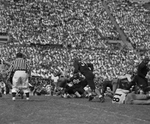 Wayne Johnson of the Oklahoma Aggies steps toward a seven-yard gain against Texas Christian University. Frogs in picture are Bill Moorman (80) and Keith Flowers (34). Published in Fort Worth Star-Telegram morning edition October , 1950.