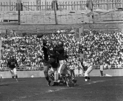 Four players reached, but Johnny Curtis (24), nearest camera, of Baylor alone met with success on this play in the Baylor-Houston game at Waco. Curtis intercepted for the Bears on the Houston 20. Published in Fort Worth Star-Telegram morning edition October 1, 1950.