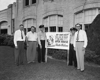Fire department officials are shown with one of the signs that invited public to inspect fire halls. Left to right are Inspector O. J. McAlister, Assistant Fire Chief Owens, Fire Chief Fontaine, Inspector W. S. Pearce and Fire Marshal Killian. Published in the Fort Worth Star - Telegram evening edition, October 4, 1950.