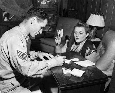 Finally, with supper finished and the boys put to bed, Sergeant and Mrs. Caldwell write checks for their rent, Community Chest pledge, Red Cross and other miscellaneous accounts.
