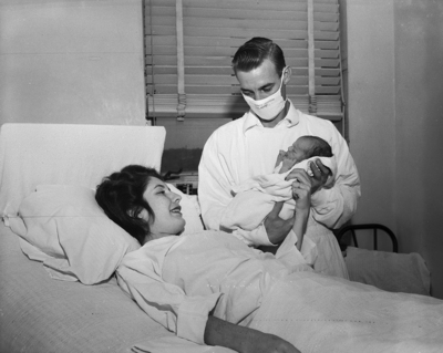 Mrs. Maxine Stegall gets a glimpse of her new baby at City-County Hospital, where Mrs. Stegall was a polio patient. Papa William Stegall is holding Nelva Elaine. Published in the Fort Worth Star - Telegram evening edition, October 2, 1950.