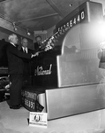 W. K. Stripling, a member of the advance gifts committee of the Community Chest drive, is manipulating the keys of the "largest cash register in the world" as Lorin Boswell, center, president of the Fort Worth Community Chest, and W. C. Meyer, chairman of the publicity committee, look on. The total amount pledged to the chest was noted each week on the register, which was on display in the southwest corner window of Stripling's. Published in the Fort Worth Star - Telegram morning edition, October 4, 1950.
