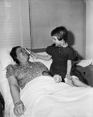 The mother and daughter duo, Mrs. T. E. Jeffreys of Bryson and Joy Jeffreys, 6, were able to see each other only a few minutes each day. Published in the Fort Worth Star - Telegram morning edition, October 8, 1950.