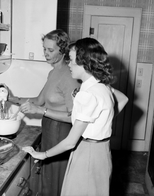 Mrs. Ellis passes along a few tips on cookery to her 4-H daughter as they work together in the large and modern kitchen in the Ellis farm home near Plainview. Published in Fort Worth Star-Telegram morning edition December 3, 1950.