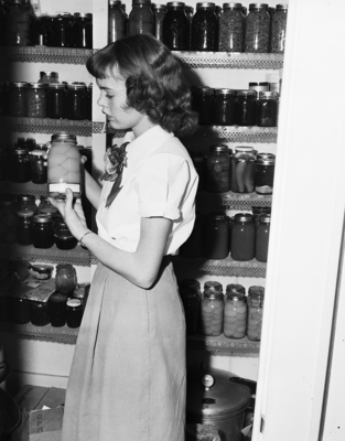 Yolanda Ellis is shown here in the well-stocked pantry where blue ribbon canned goods and preserves fill the shelves. Published in Fort Worth Star-Telegram morning edition December 3, 1950.