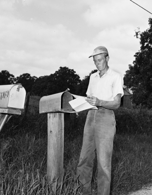 Piper stands by his mailbox, reading the report on his soil test. Now he has a better idea on what his new land will need to produce a profitable crop. the tract is southwest of Everman and is some of the best land in Tarrant County. Published in Fort Worth Star-Telegram November 5, 1950.
