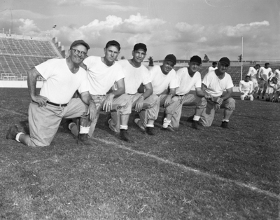 Image of the six-man coaching staff, which directs all Frogs' football activities. Left to right: L. R. Meyer, Abe Martin, Allie White, Byron Brannon, Walter Roach, and H. R. McQuillan. Published in Fort Worth Star-Telegram evening edition October 2, 1950.