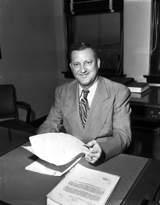 Image shows a bust shot of Dan B. Courville, production supervisor of Gulf Oil Corporation, Fort Worth production division. He was in Gulf's Odessa production district from 1927-1947 and for the past 3.5 was assigned to the eastern Venezuelan division of Mene Grande Oil Company, a Gulf subsidiary. He is shown to be seated at desk. Published in the Fort Worth Star-Telegram morning edition, November 5, 1950.
