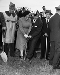Work on the Veterans Memorial Building, planned for more than two years, gets under way as ground breaking ceremonies are conducted by, left to right, Ray Bertholf of the Fort Worth post of the 40 and 8; Mrs. Gus Tahr, vice president of 4th District gold Star Mothers; Claude H. Latson, president of Veterans Memorial, Inc.; and B. J. Rafferty, Veterans Memorial chaplain. Published in the Fort Worth Star - Telegram morning edition, October 4, 1950.