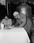 E. Claude Manning, 2314 mistletoe Avenue, was the first Fort Worth citizen to sign the scroll in the shadow of the Freedom Bell placed in Burk Burnett Park. Mrs. Arthur Conrad, with Manning, was one of a committee from the Beta Sigma Phi sorority in charge of obtaining signatures and contributions to the Crusade for Freedom. The bell, a replica of a huge Freedom Bell unveiled in Berlin on United Nations Day. Published in the Fort Worth Star - Telegram evening edition, October 3, 1950.