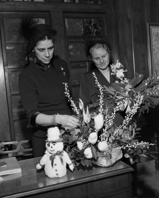 Mrs. Anne Wertsner Wood, left, of Swarthmore, Pennsylvania, shows Mrs. Max Farmer, a member of the Fort Worth Council of Nationally Accredited Flower Show judges, how to make Christmas decorations at home. The class for the judges was held at the Garden Center. Mrs. Wood was the author of "Make Your Own Merry Christmas." Published in the Fort Worth Star - Telegram evening edition, October 6, 1950.