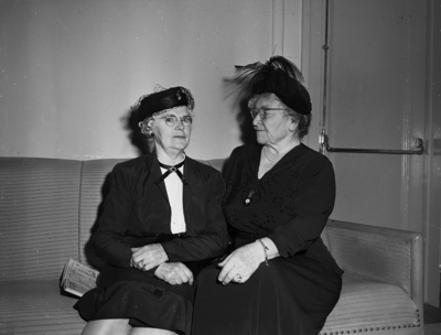 Mrs. H. F. Godeke of Lubbock, left, state parliamentarian, discusses the parliamentary law classes she conducted for the Fort Worth Council, P-TA, with Mrs. J. H. Moore of Deport, president of the Texas Congress of Parents and Teachers. Published in the Fort Worth Star - Telegram evening edition, October 5, 1950.