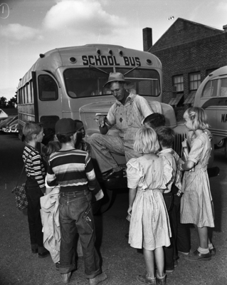 Homer Stone, who has driven a school bus for 10 years, gives some sound advice to a few of his Mansfield school passengers. Published in the Fort Worth Star - Telegram morning edition, October 8, 1950.