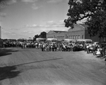 The 300-odd pupils who ride to and from the Mansfield School daily line up before entering six of the seven buses owned by the district. Superintendent R. L. Huffman (standing near bus at right) takes a personal interest in operation of the buses. Published in the Fort Worth Star - Telegram morning edition, October 8, 1950.