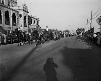 This long line of cowboys and cow girls made up part of the parade in Mineral Wells that preceded the opening of the three-night Palo Pinto County Livestock Association rodeo. Many of the riders shown above competed in the various rodeo events. Published in the Fort Worth Star - Telegram morning edition, October 6, 1950.