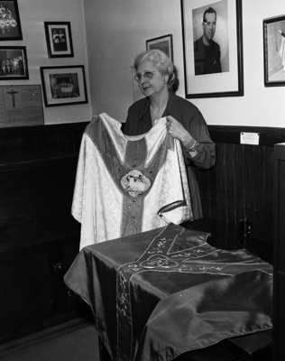 Mrs. W. F. Salt displays vestments for the rector which are the work of members of the daughters of the King at Saint John's Episcopal Church. Published in the Fort Worth Star - Telegram evening edition, October 7, 1950.