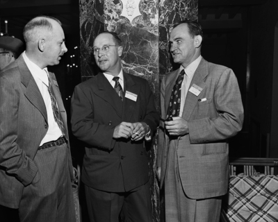Recess talk during Texas Pediatric Society meeting at Fort Worth involved, left to right, Drs. C. S. E. Touzel of Fort Worth, A. W. Pierce of Wichita Falls and E. M. Wier of Fort Worth. Published in the Fort Worth Star - Telegram morning edition, October 7, 1950.