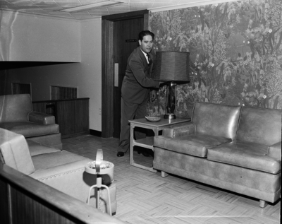 James C. Mosley, manager of Milam's Cafeteria, turns on the lights for the establishment's well-appointed lounges. The cafeteria reopened at its new location, 509-511 Main St. Established at Fort Worth in 1940. Published in the Fort Worth Star - Telegram morning edition, October 8, 1950.