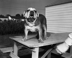 Omaha Ginger, owned by Mr. and Mrs. E. W. Ivey, 3109 Purington, was selected best of opposite sex in the Lone Star bulldog club's recent 38 dog sanction match for puppies in Dallas. Another Fort Worth bulldog, Gorgeous George, owned by Sid Henson, was best in match. Published in the Fort Worth Star - Telegram morning edition, October 8, 1950.