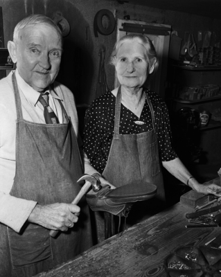Mr. and Mrs. W. N. Hill of Granbury had been married 57 years. Hill gets help from Mrs. Hill in their shoe repair shop when business was rushing. Published in the Fort Worth Star - Telegram evening edition, October 11, 1950.